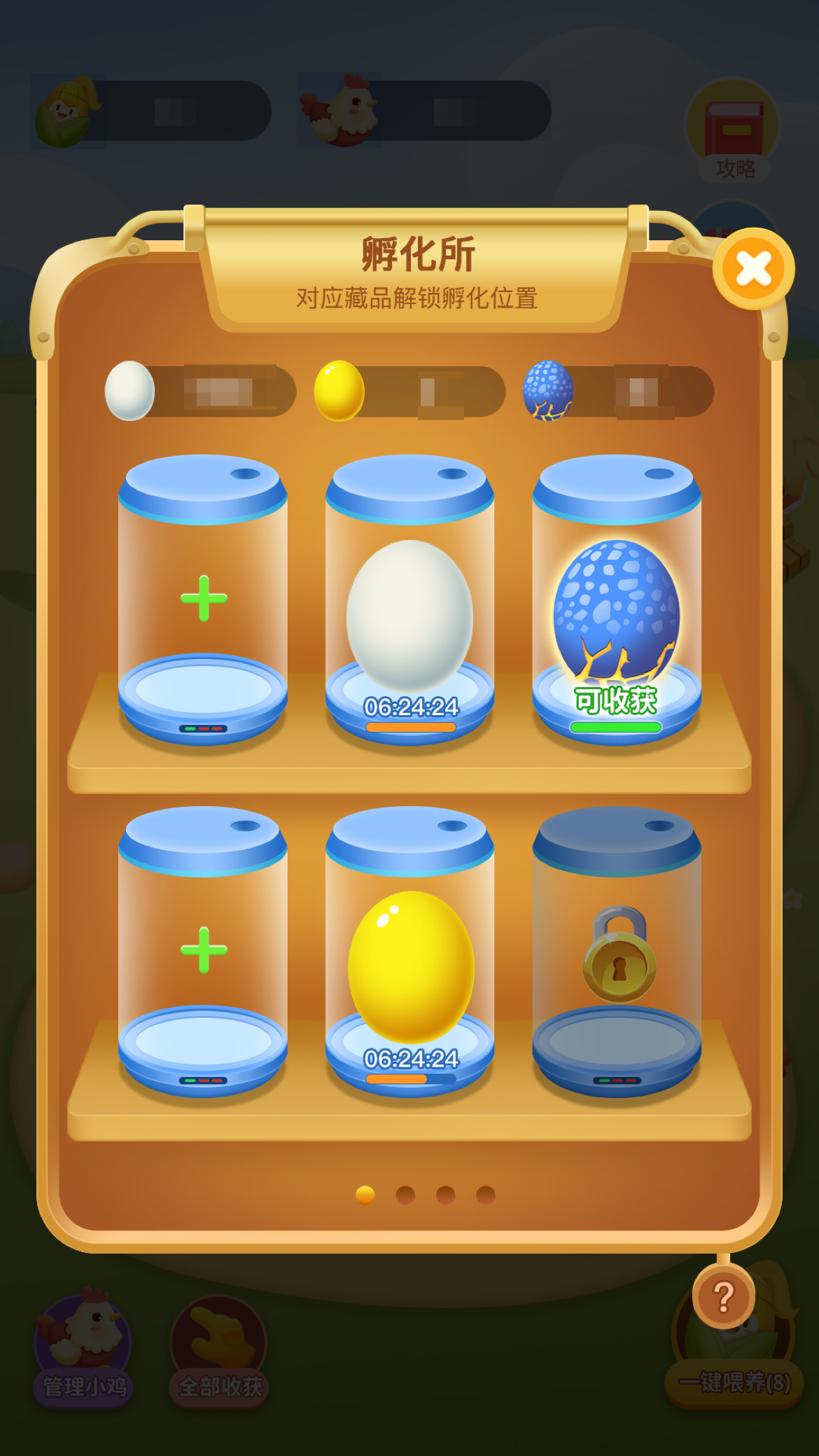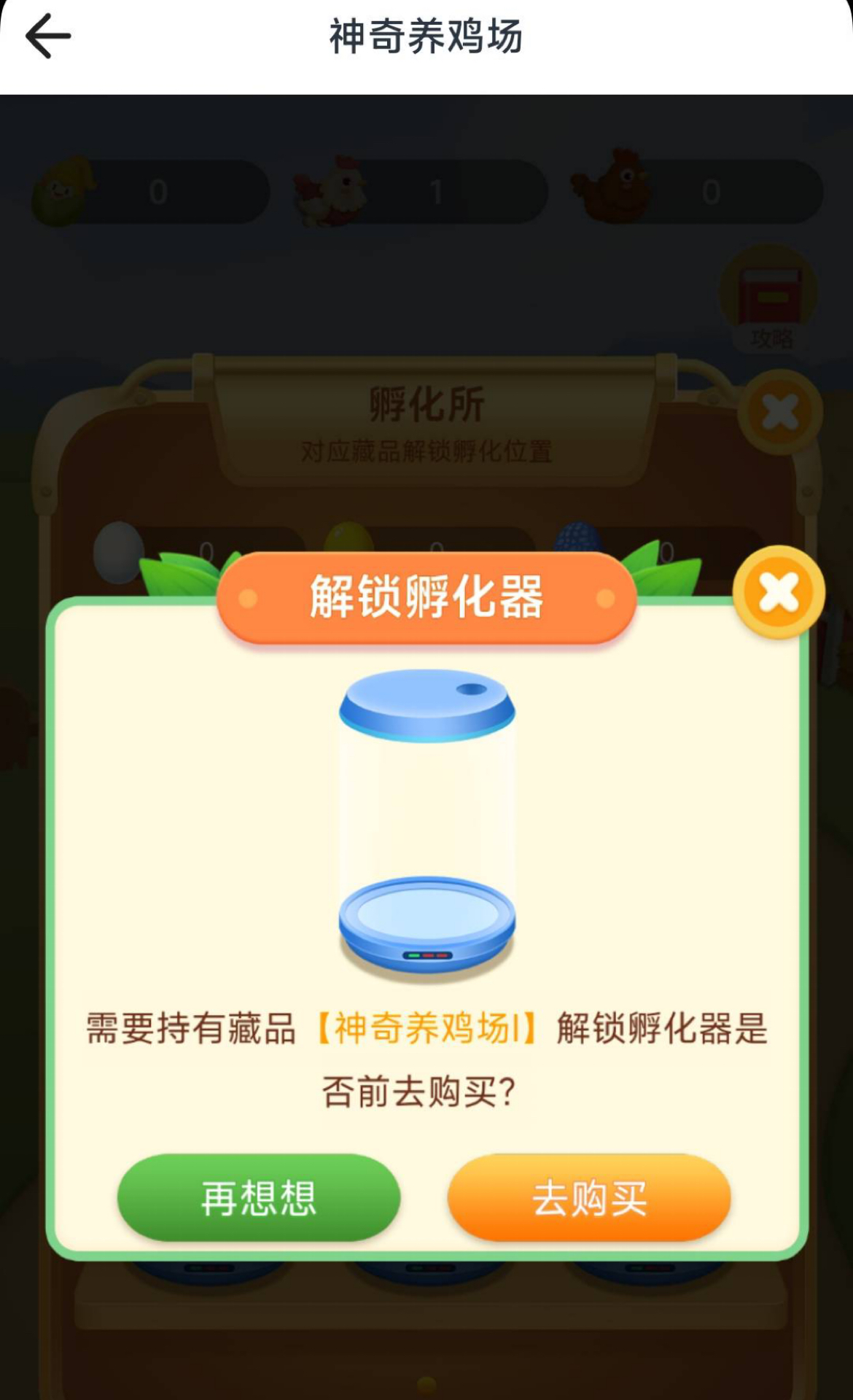 2.玩家每持有一份「神奇养鸡场 I」,即可解锁一个孵化器,孵蛋后进入24小时倒数,倒数结束后即可收获对应小鸡。