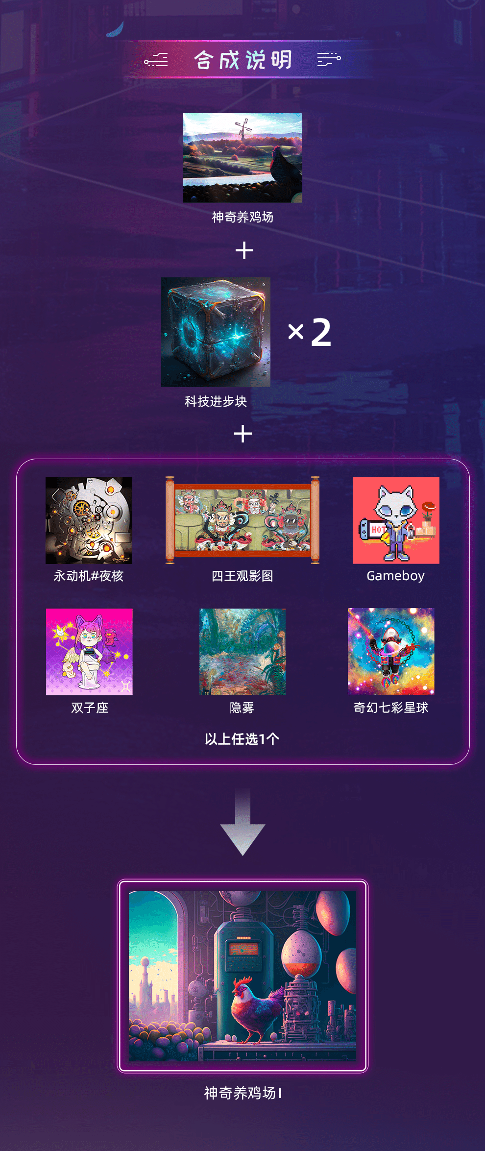 集齐「永动机#夜核」、「四王观影图」、「Gameboy」、「双子座」、「隐雾」、「奇幻七彩星球」以上藏品任意1份;1份「神奇养鸡场」;2份「科技进步块」,即可合成1份「神奇养鸡场 I」,限量合成500份;合成操作不会影响【神奇养鸡场】游戏进程,正在下蛋的小鸡正常计时。
