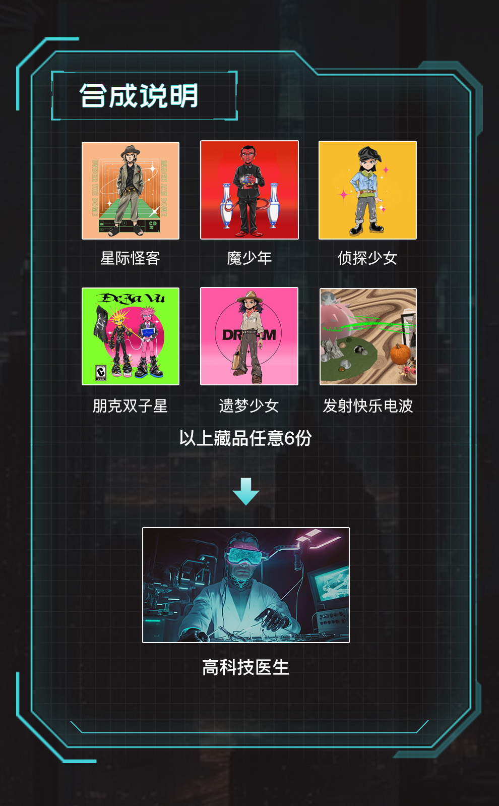 玩家每消耗星际怪客、魔少年、侦探少女、朋克双子星、遗梦少女、发射快乐电波以上藏品任意6份即可合成1份「高科技医生」,限量合成400份。