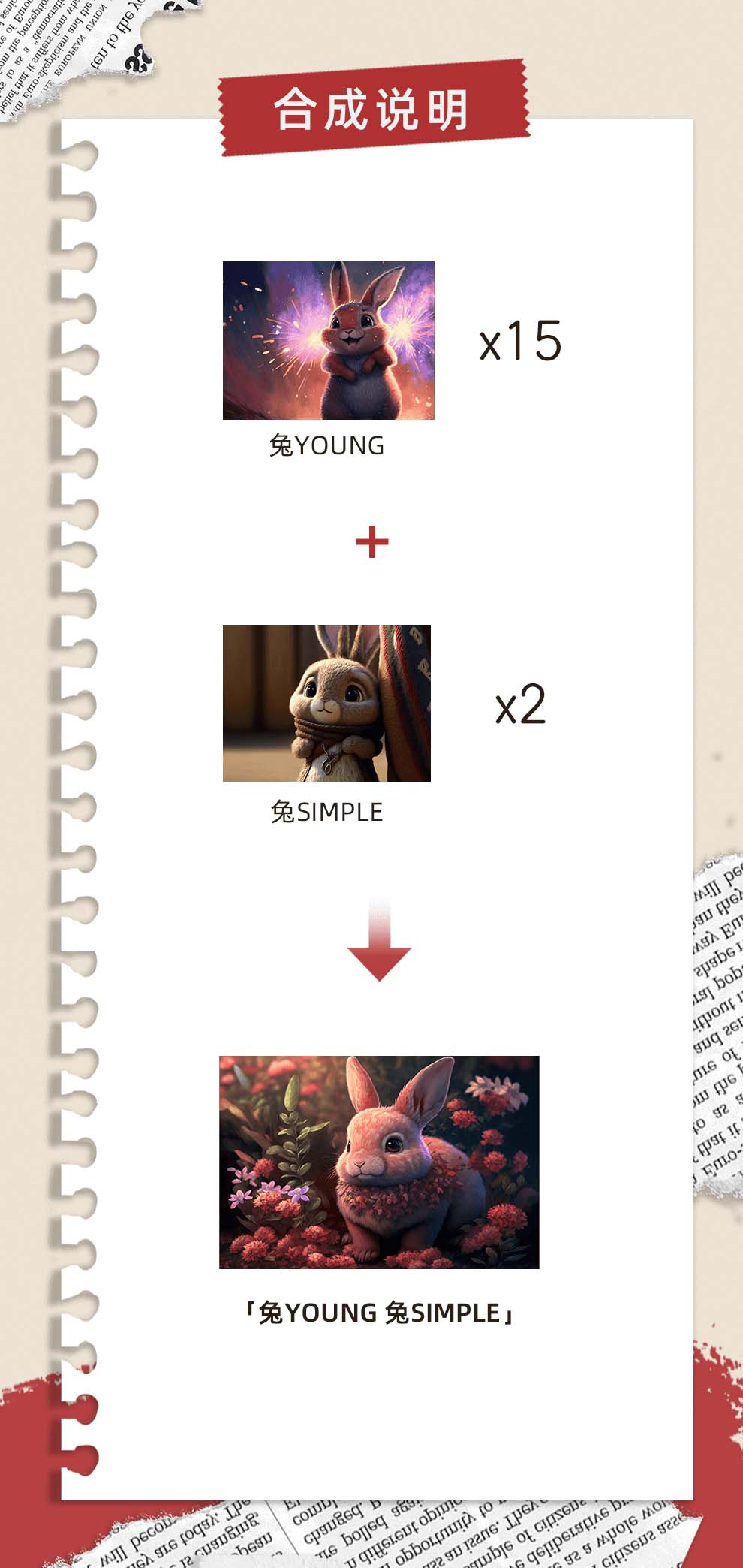 集齐15份「兔YOUNG」和2份「兔SIMPLE」即可合成1份「兔YOUNG兔SIMPLE」,限量合成1000份。