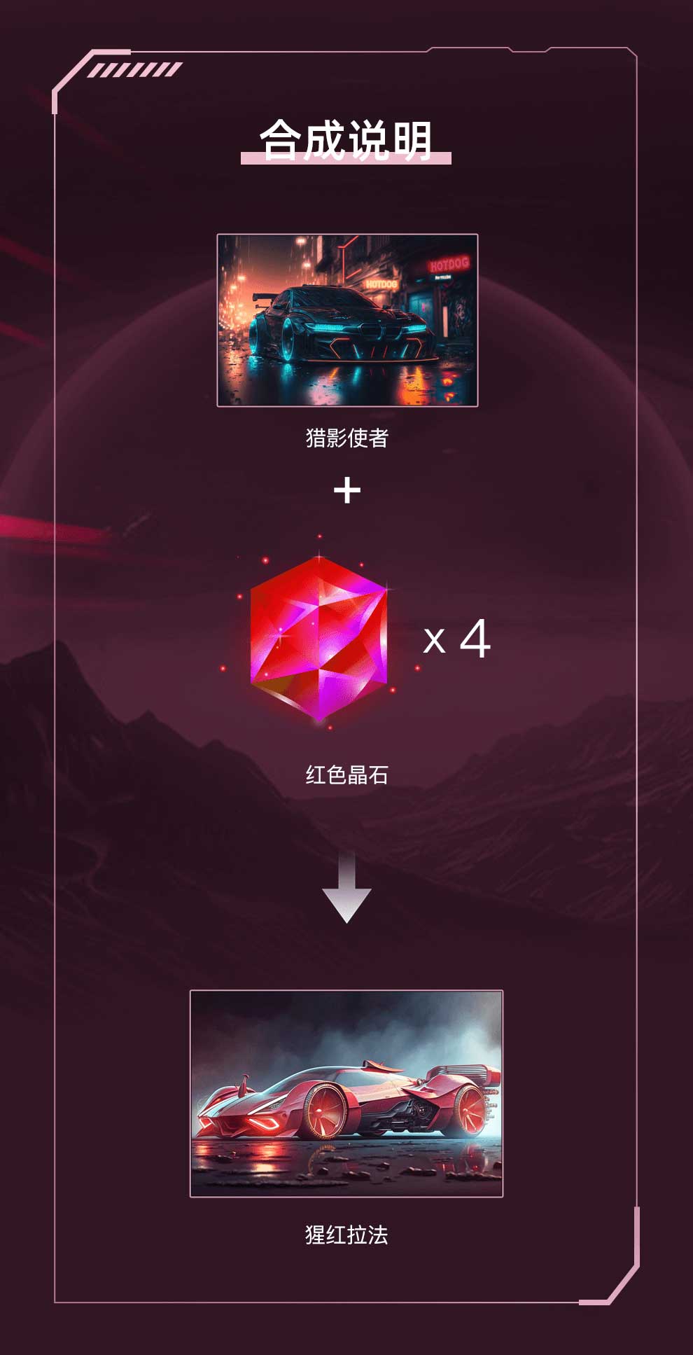 集齐1份「猎影使者」、4份「红色晶石」即可改装成为「猩红拉法」,限量合成300份。