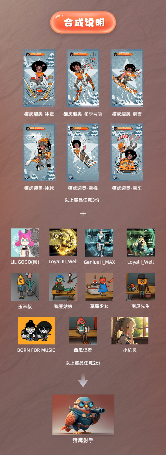 - 猫虎迎奥-冰壶、猫虎迎奥-冬季两项、猫虎迎奥-滑雪、猫虎迎奥-冰球、猫虎迎奥-雪橇、猫虎迎奥-雪车以上任意3份藏品;
