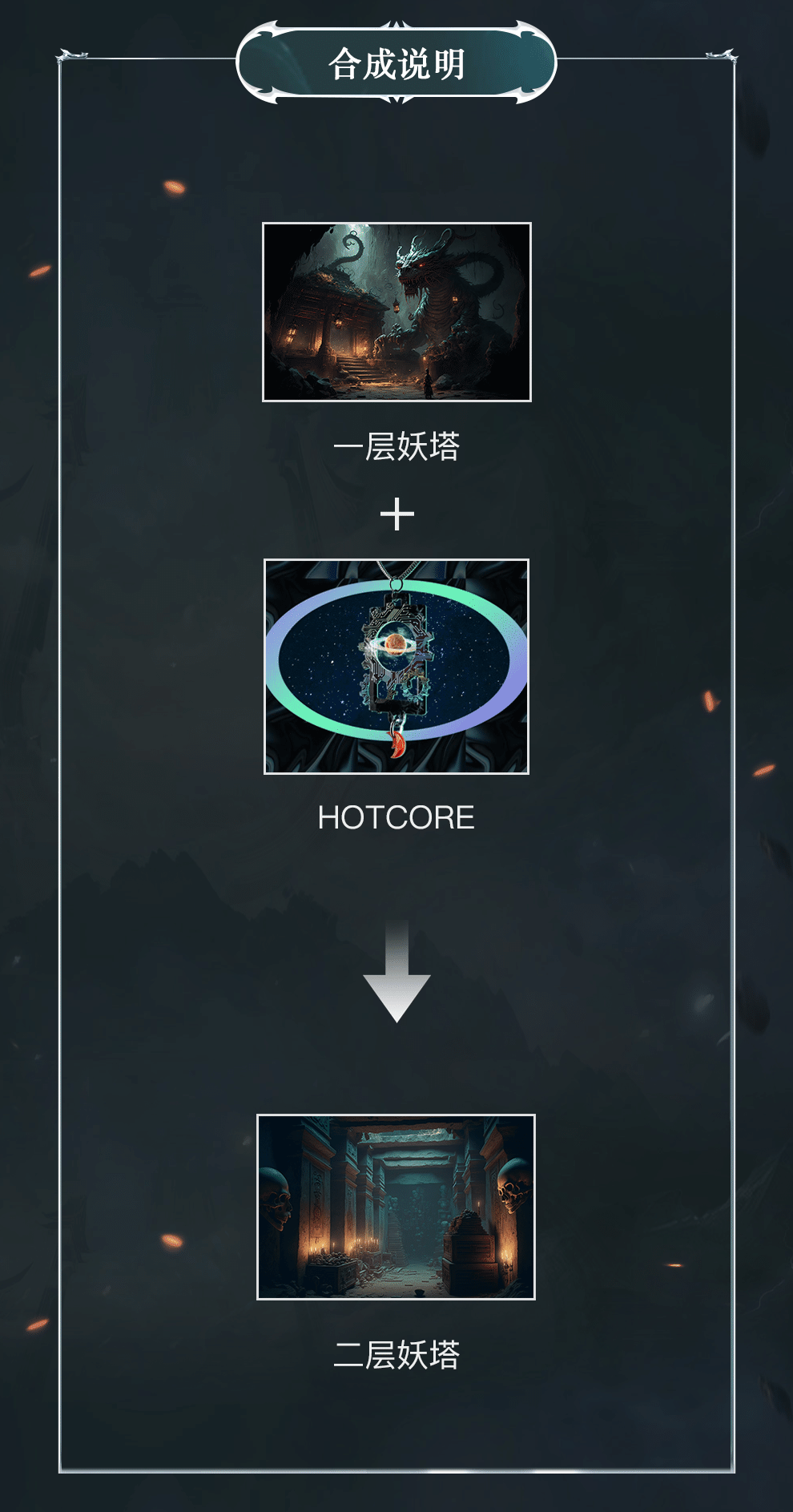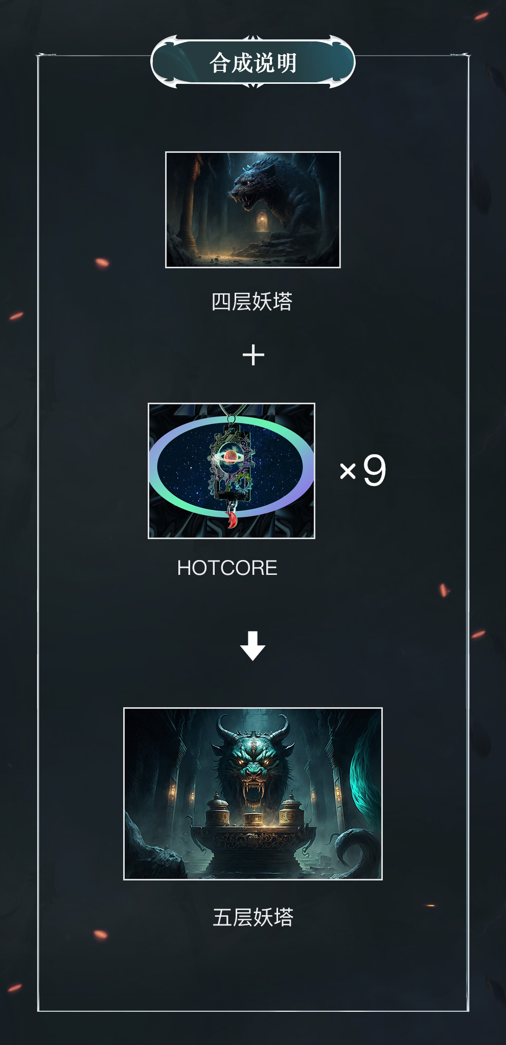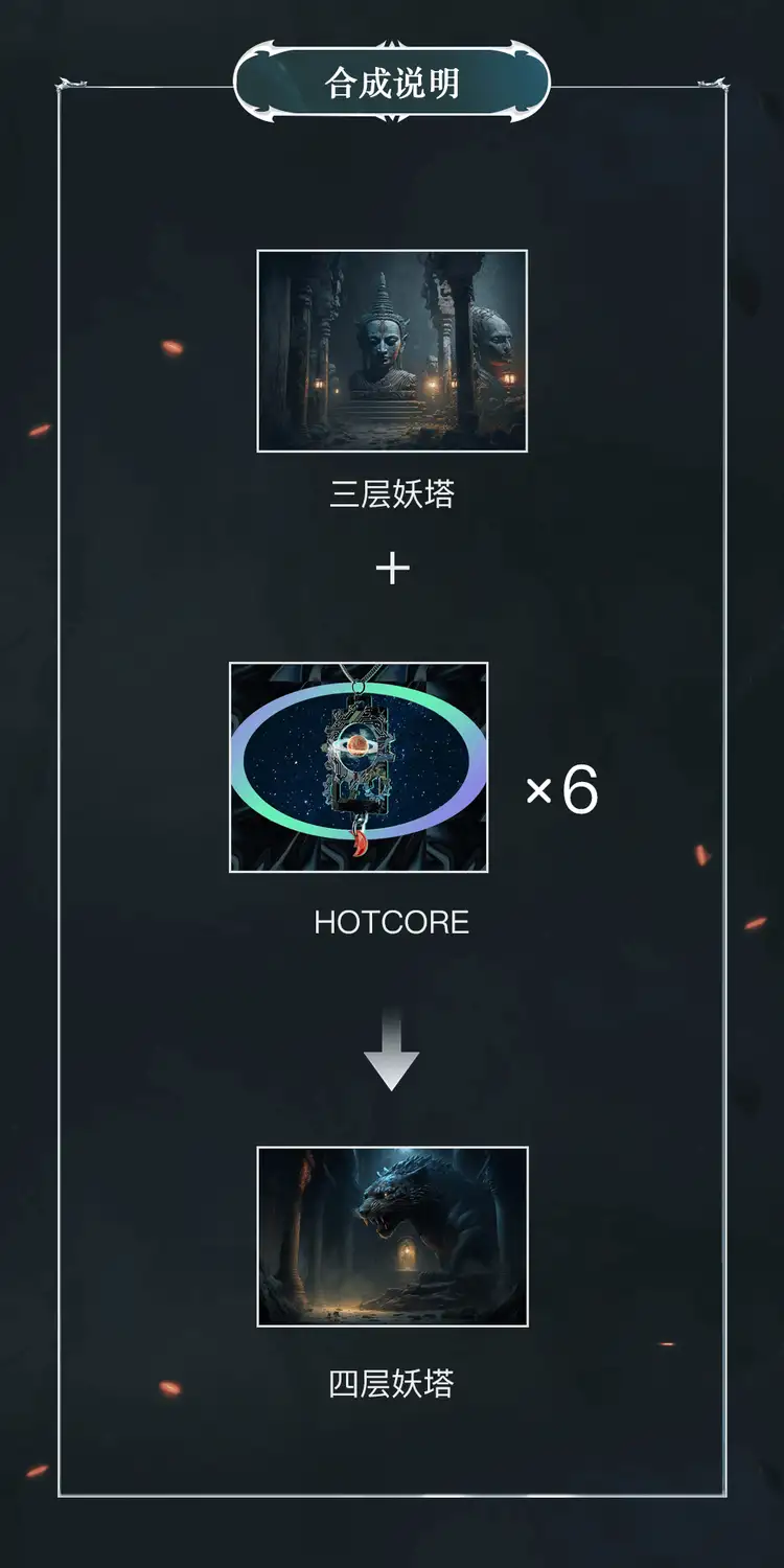 - 玩家每消耗1份「一层妖塔」+1份「HOTCORE」可合成1份「二层妖塔」;