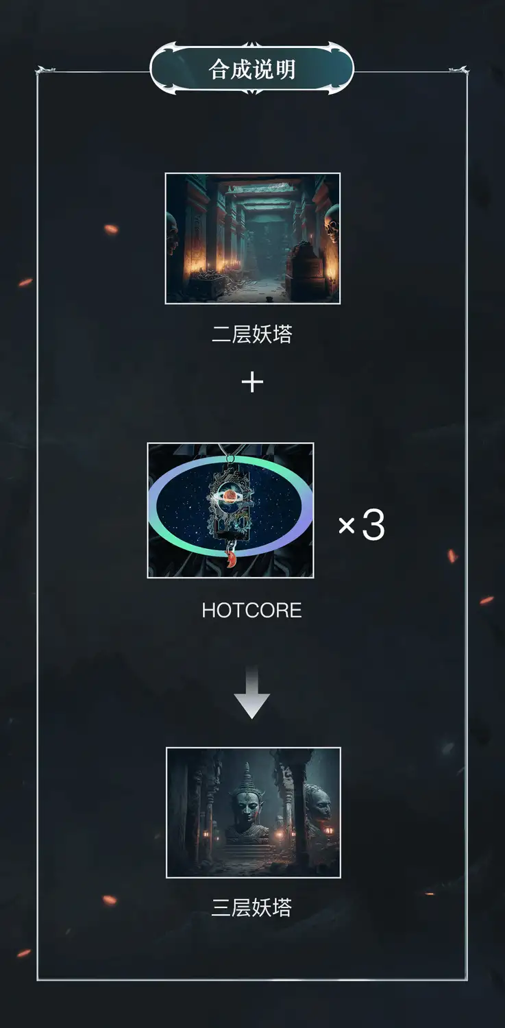 - 玩家每消耗1份「二层妖塔」+3份「HOTCORE」可合成1份「三层妖塔」;