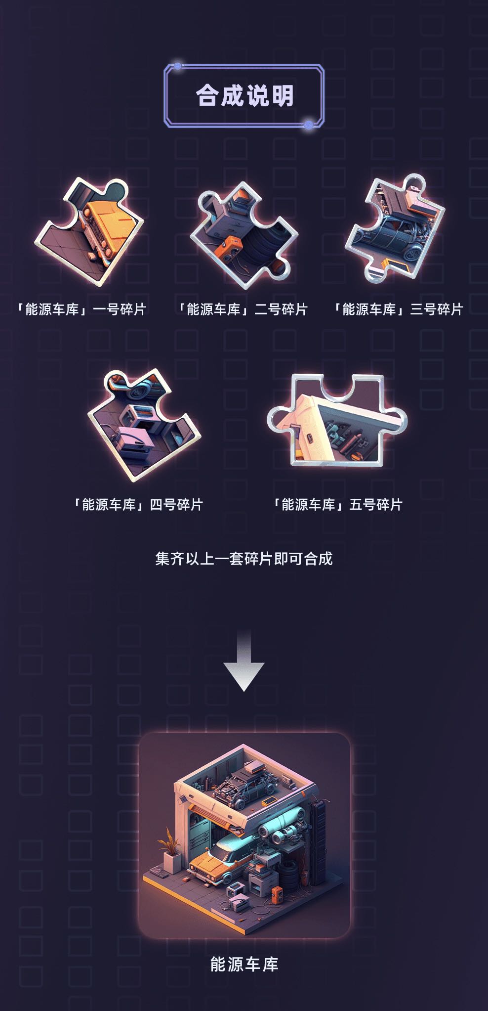 玩家每消耗编号为1、2、3、4、5的一套5个「能源车库」碎片即可合成1份建筑藏品「能源车库」,限量200份。