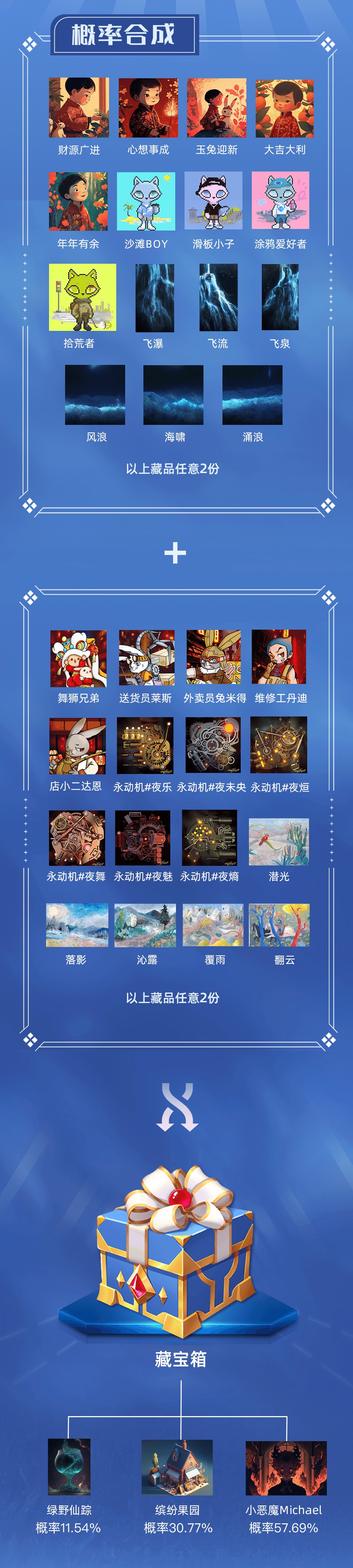 「舞狮兄弟」、「送货员莱斯」、「外卖员兔米得」、「维修工丹迪」、「店小二达恩」、「永动机#夜乐」、「永动机#夜未央」、「永动机#夜烜」、「永动机#夜舞」、「永动机#夜魅」、「永动机#夜熵」、「潜光」、「落影」、「沁露」、「覆雨」、「翻云」以上藏品任意2份;