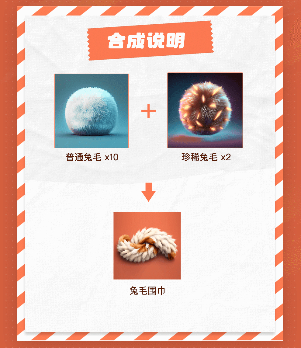 集齐2份「珍稀兔毛」道具+10份「普通兔毛」道具,即可合成一份「兔毛围巾」藏品,限量300份。