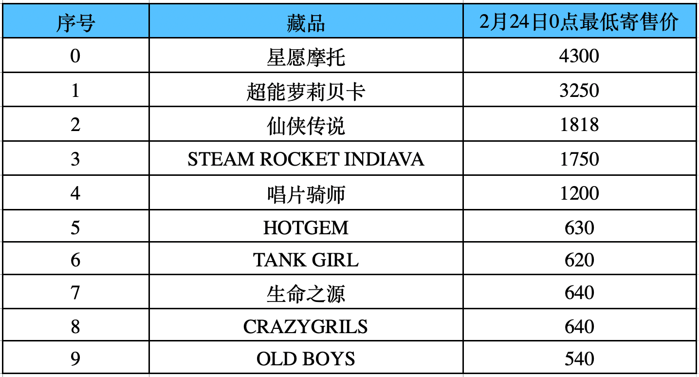 - 快照时间:系统已于2月24日0:00对名单中10款藏品寄售最低价快照,用于计算平均回收价,本次平均回收价1539元,故今日10款藏品总成交价若抵达1539 x 2.2 x 10=33858元,回收活动即可开启;
