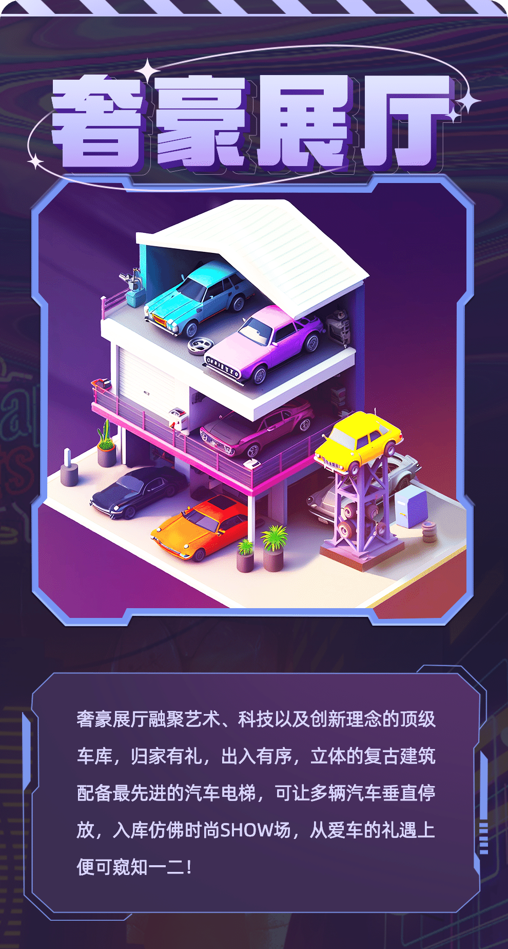 超跑停靠在「能源车库」(一级车库)与「奢豪展厅」(二级车库)将为每位超跑(「猩红拉法」、「墨绿威龙」、「蓝皇派克峰」)车主带来独一无二的持续性收益。