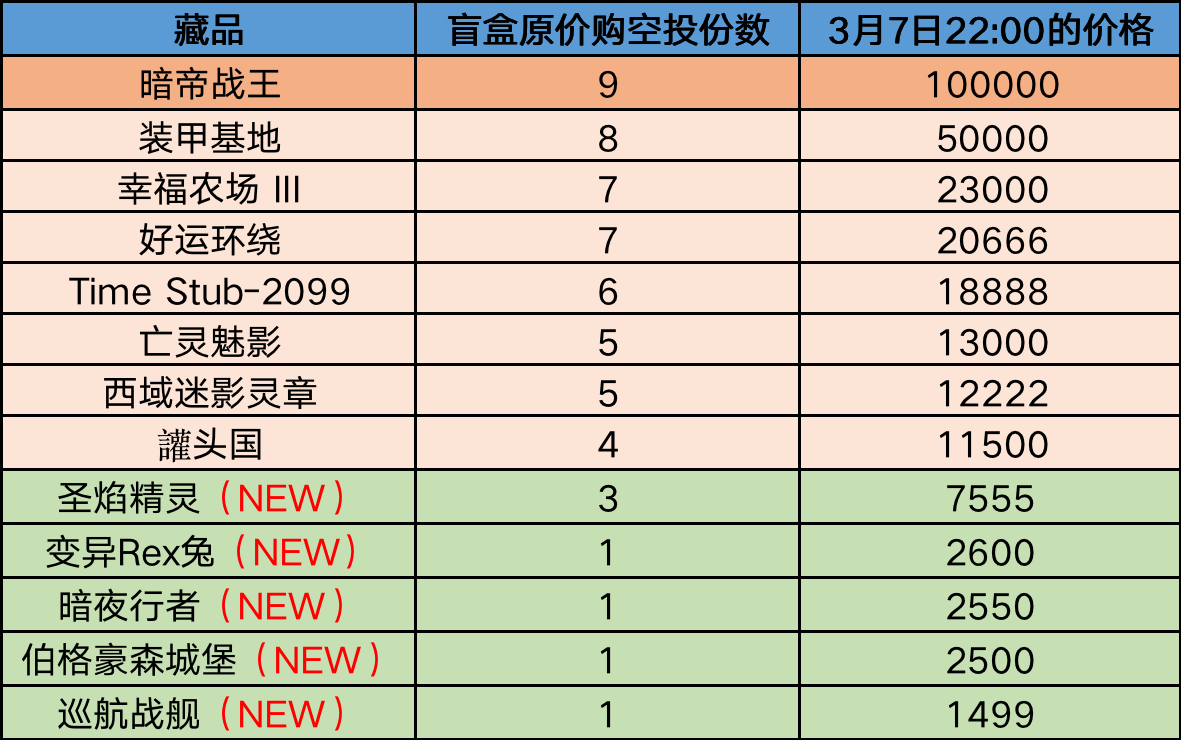 3.已给过盲盒赋能的,但市场价稳定在10000元以上的稀有度较高的未寄售合成款/升级款/隐藏款藏品,如「暗帝战王」、「好运环绕」,但本轮空投份数将会适当调整。