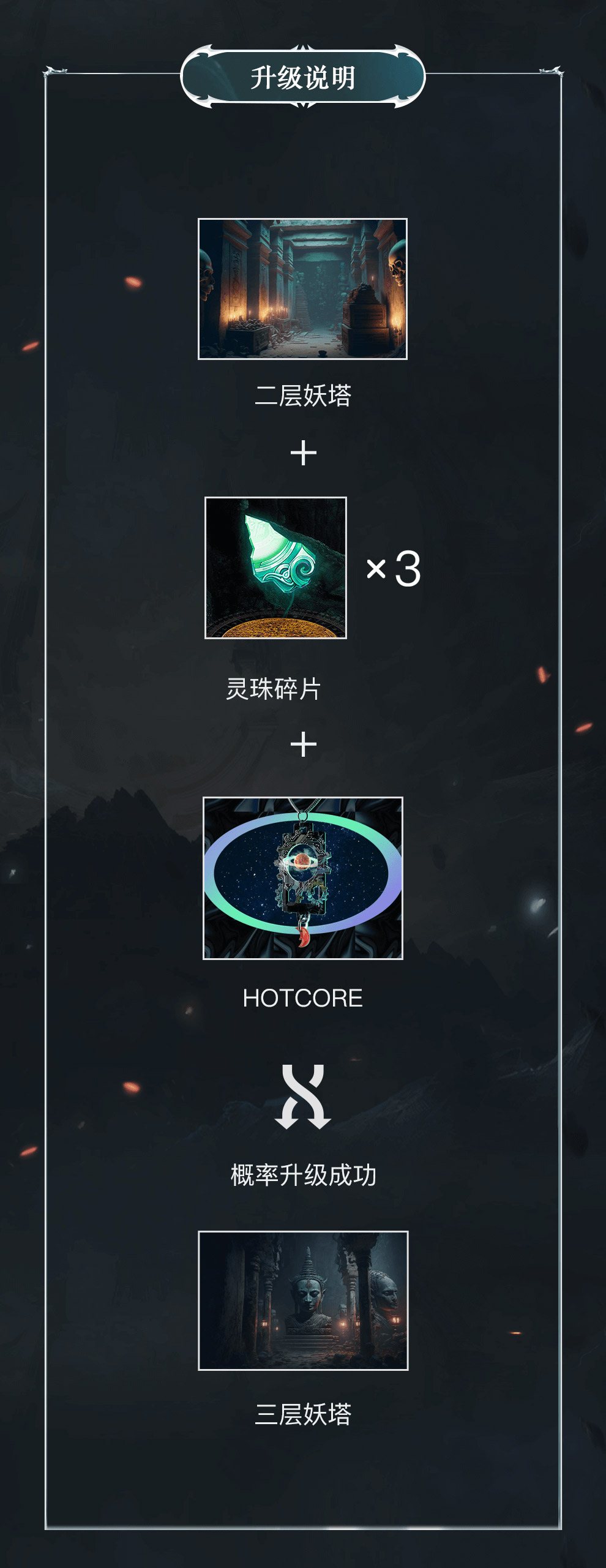 - 升级失败:「二层妖塔」藏品保留,「HOTCORE」与「灵珠碎片」消耗,玩家可继续为「二层妖塔」藏品升级;