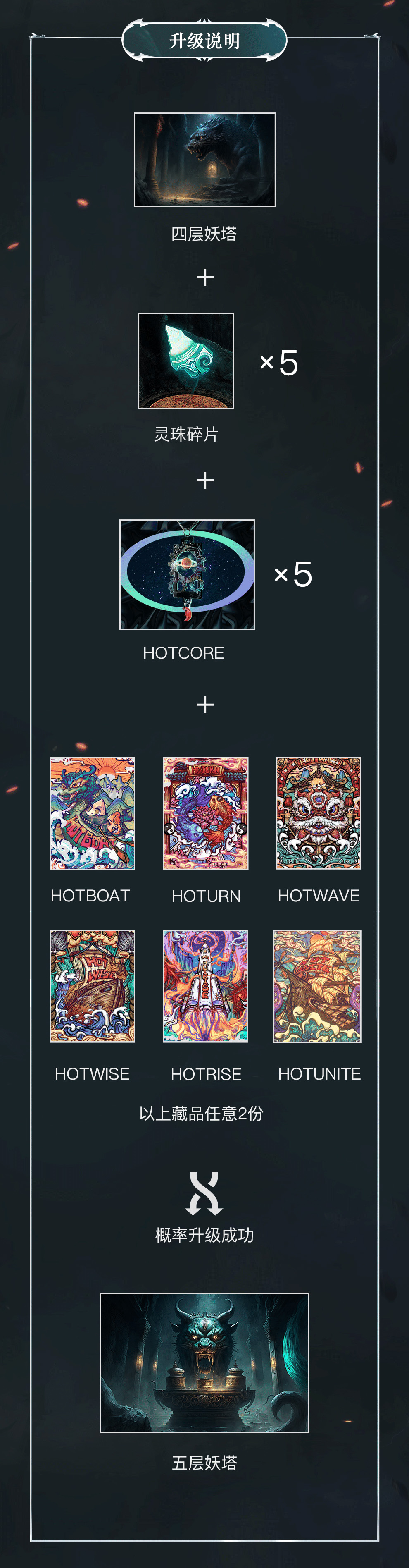 - 本次升级失败概率25%:「四层妖塔」藏品保留,其余藏品与道具消耗,玩家可继续为「四层妖塔」藏品升级;
