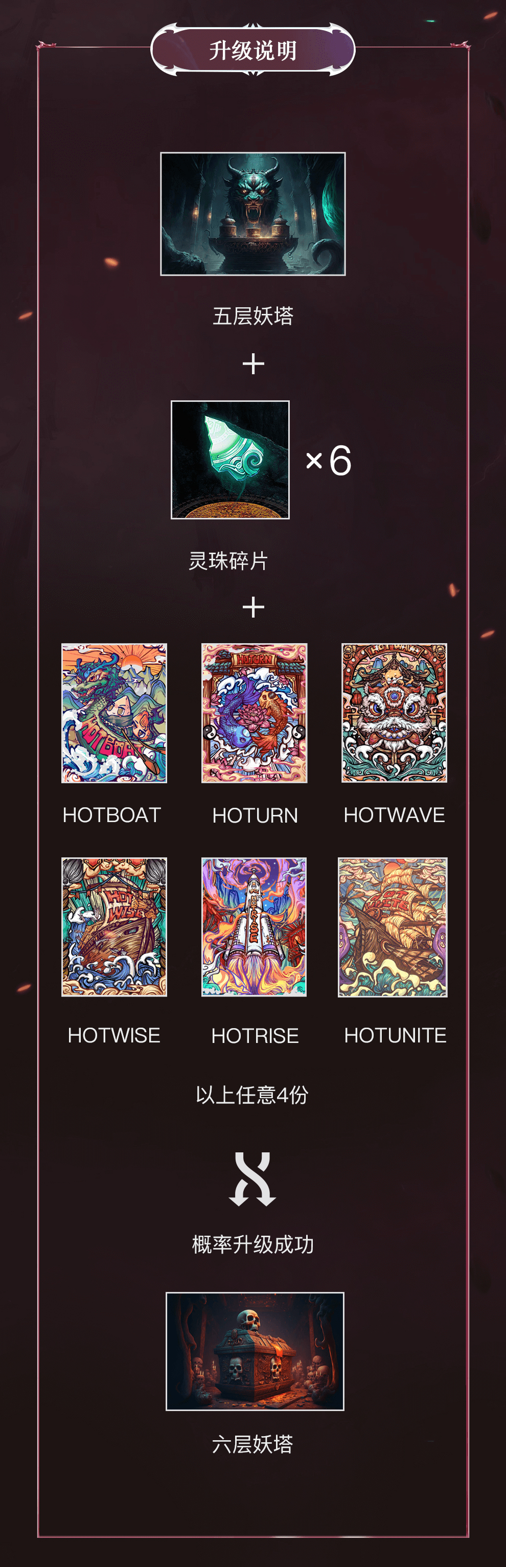 - 本次升级失败概率20%:「五层妖塔」藏品保留,其余藏品与道具消耗,玩家可继续为「五层妖塔」藏品升级;