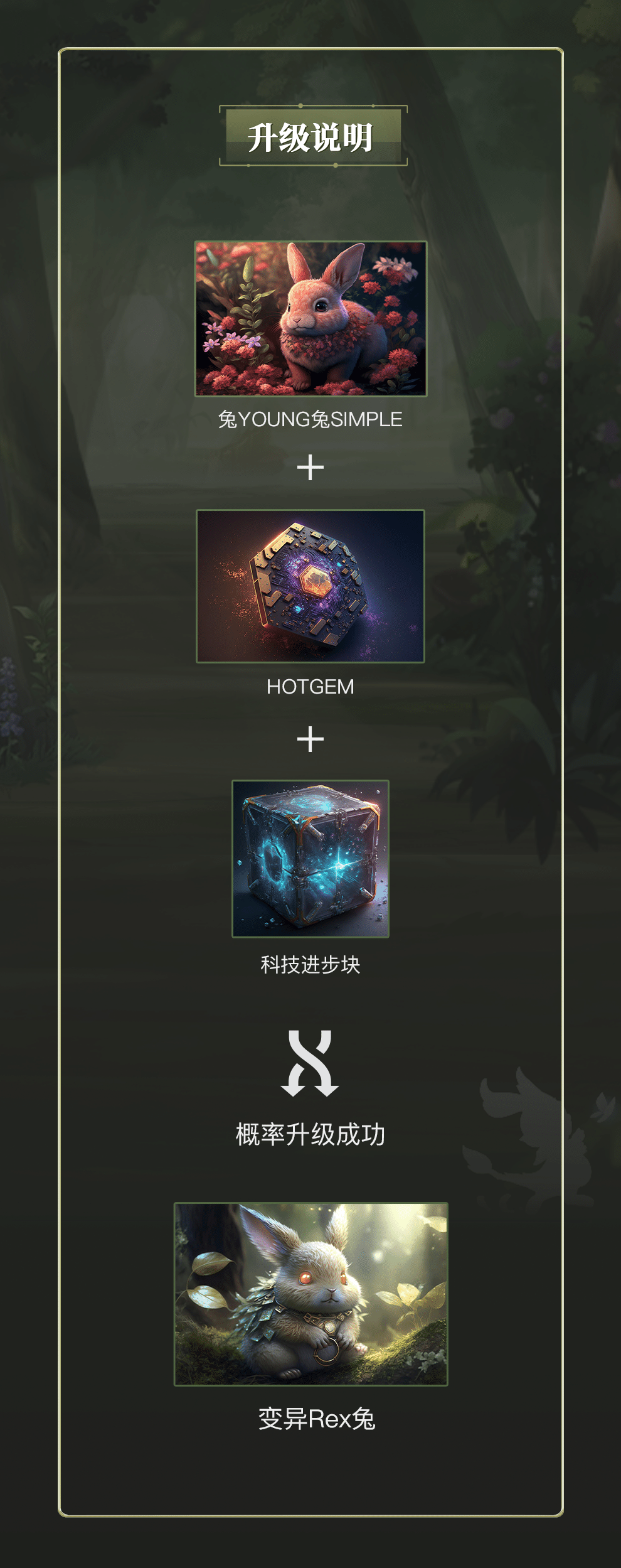 - 升级成功:获得1份新藏品「变异Rex兔」,「兔YOUNG兔SIMPLE」藏品、「HOTGEM」藏品和「科技进步块」道具随即消耗;