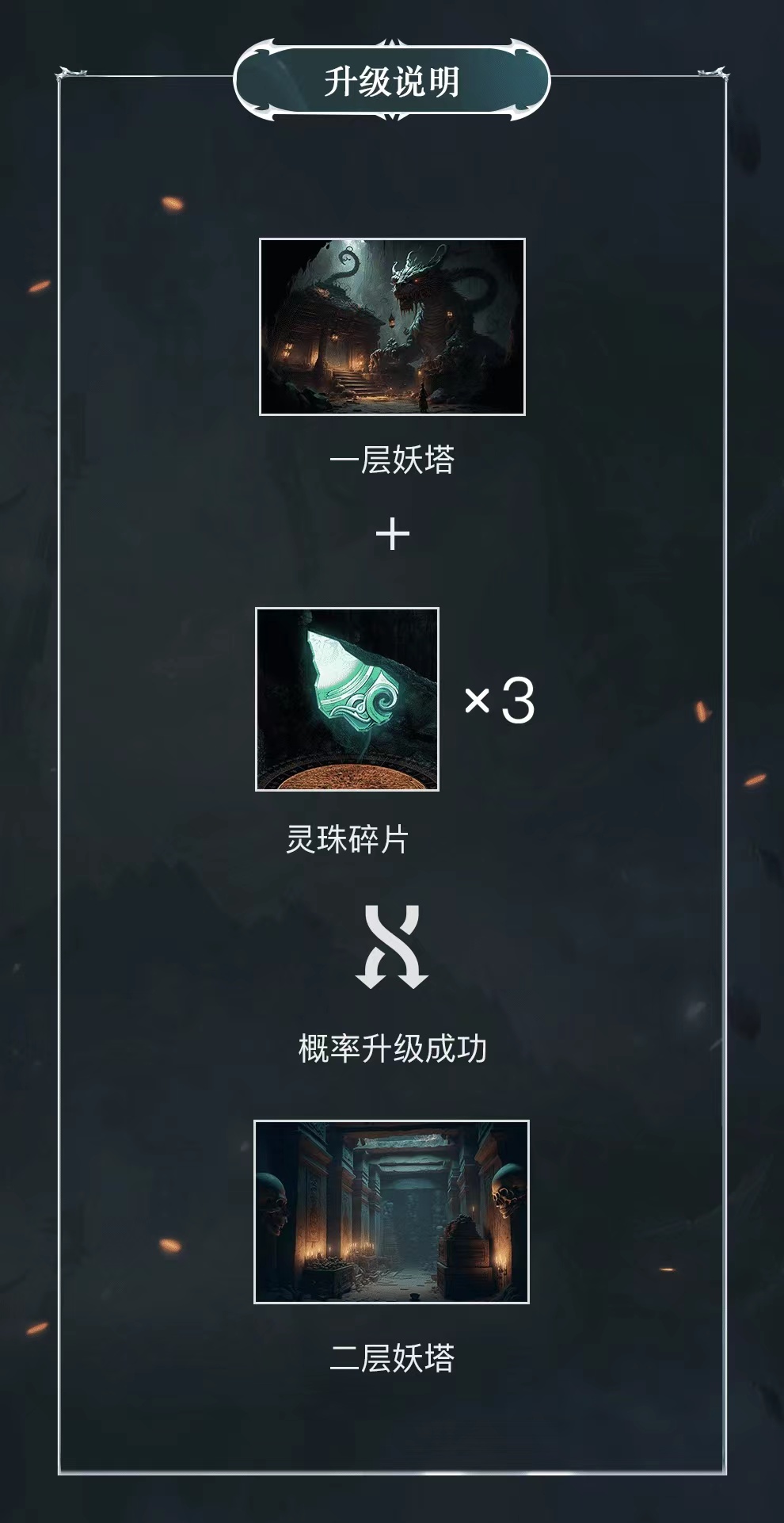 持有「一层妖塔」与3份「灵珠碎片」即有概率升级成功获得1份「二层妖塔」,升级过程中,有机率升级成功或失败: