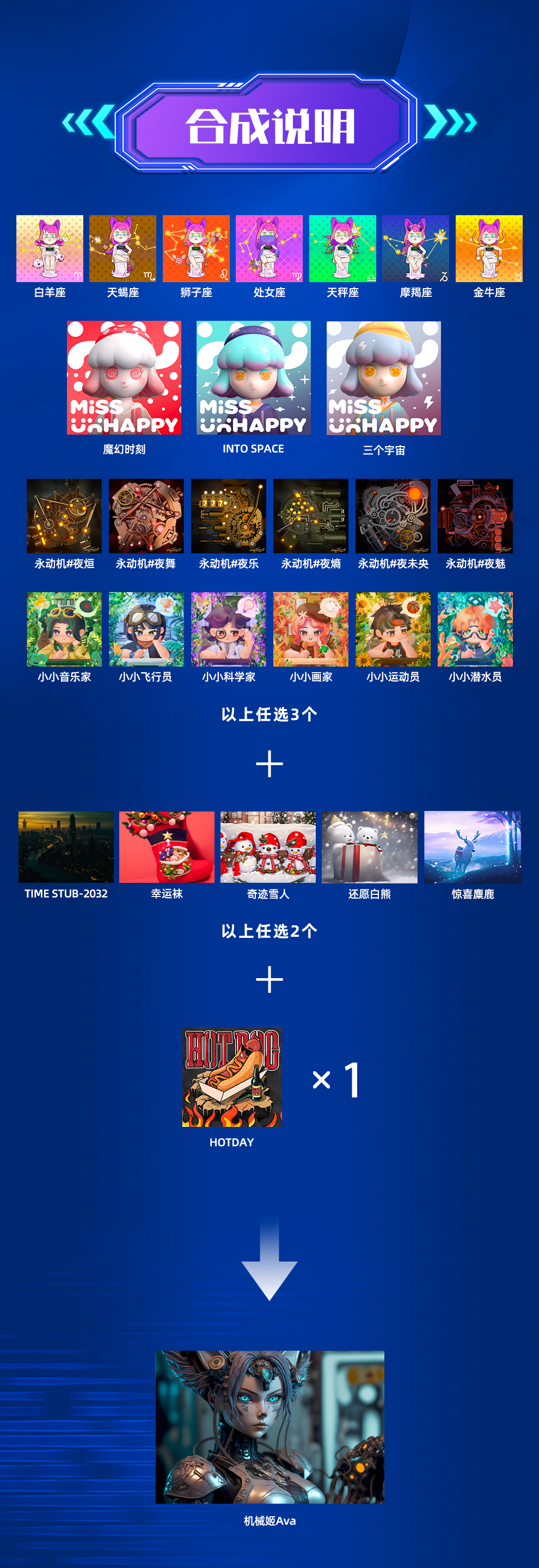 - (白羊座、天蝎座、狮子座、处女座、天秤座、摩羯座、金牛座、魔幻时刻、INTO SPACE、三个宇宙、永动机#夜烜、永动机#夜舞、永动机#夜乐、永动机#夜熵、永动机#夜未央、永动机#夜魅、小小音乐家、小小飞行员、小小科学家、小小画家、小小运动员、小小潜水员)以上藏品任意3份;