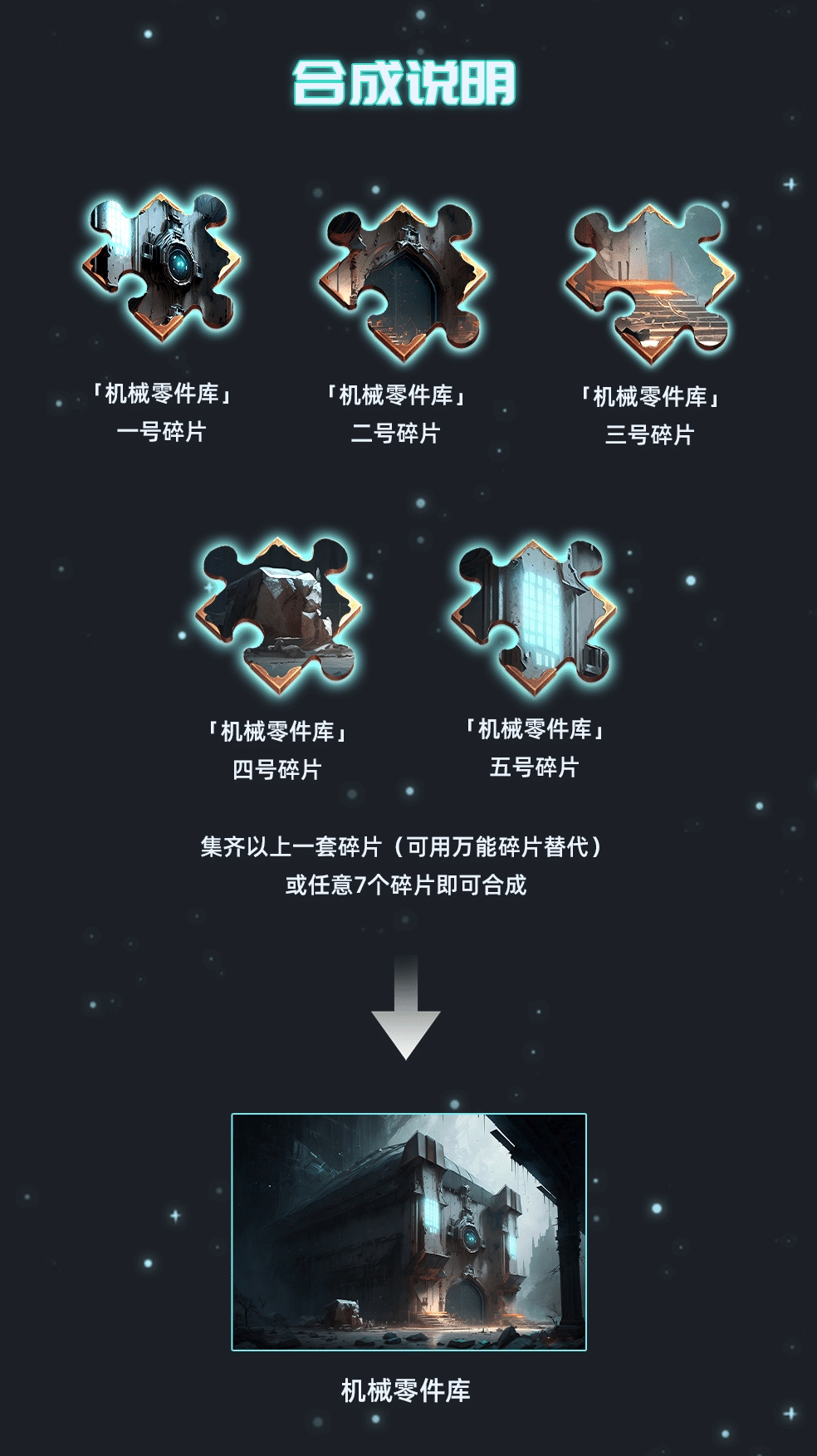 - 任意7份机械零件库藏品碎片(举例:4份「1号碎片」+3份「2号碎片」、3份「4号碎片」+3份「5号碎片」+「1份万能碎片」,以上两种方式均可合成)
