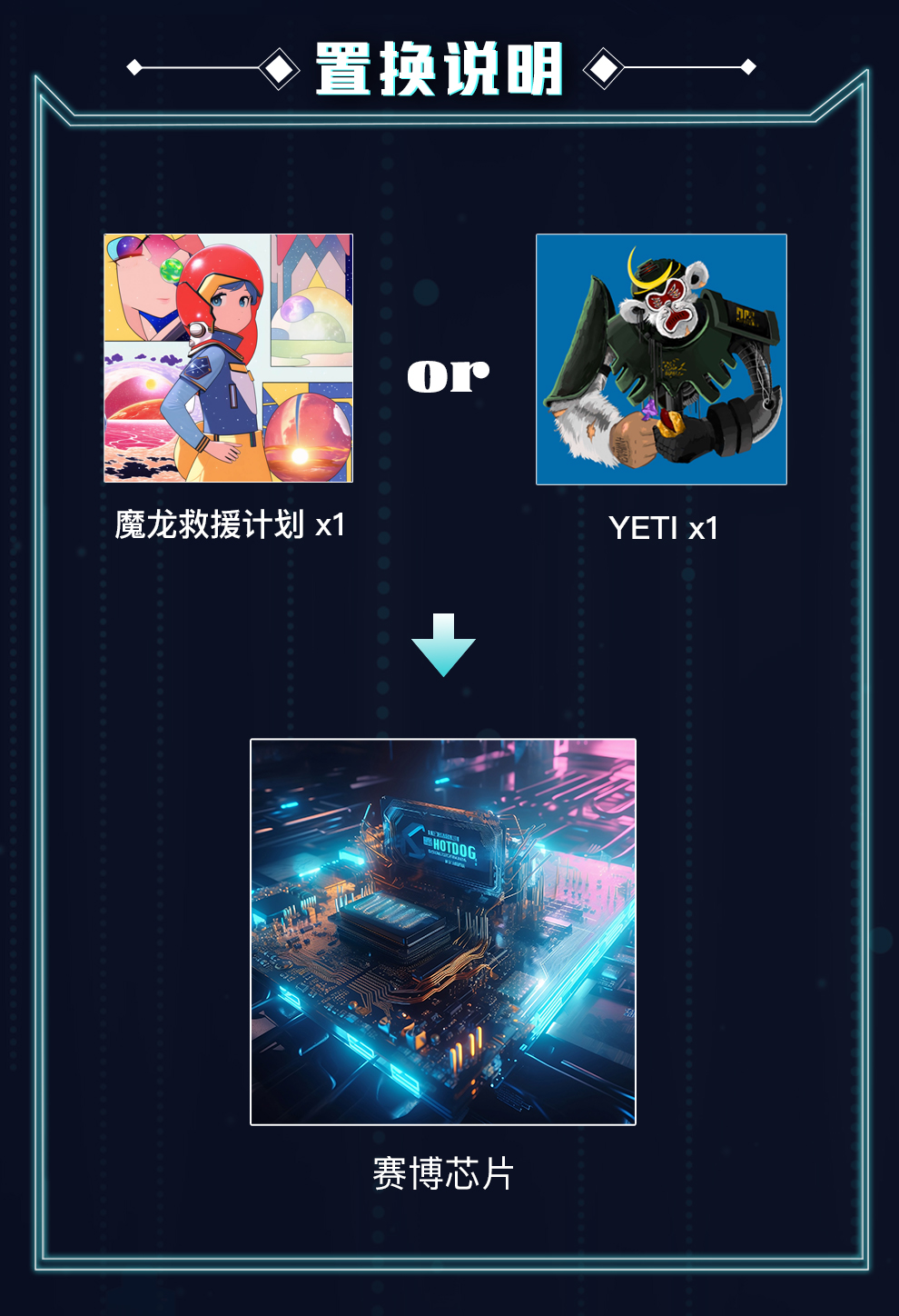 每持有1份「魔龙救援计划」或「YETI」,即可置换1份「赛博芯片」,限量置换400份,数量有限,先到先得。