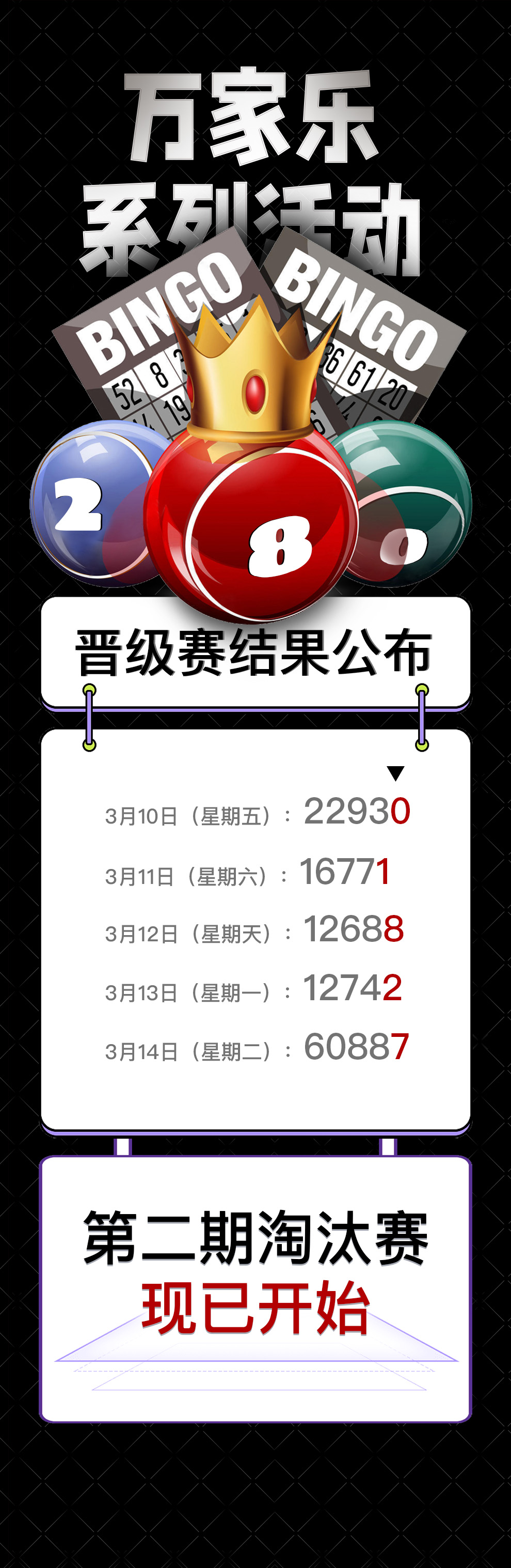 每一天都将是新的开始,人们永远不能预测一下秒将会发生怎样的事情,又或者预测今天会过得如何,而每一秒的新鲜感也将成为生活的调味品,为大家平淡的日子里带来一些五彩斑斓的色彩。万家乐活动已结束了第1部分的晋级赛,第2部分淘汰赛也于3月15日开启!