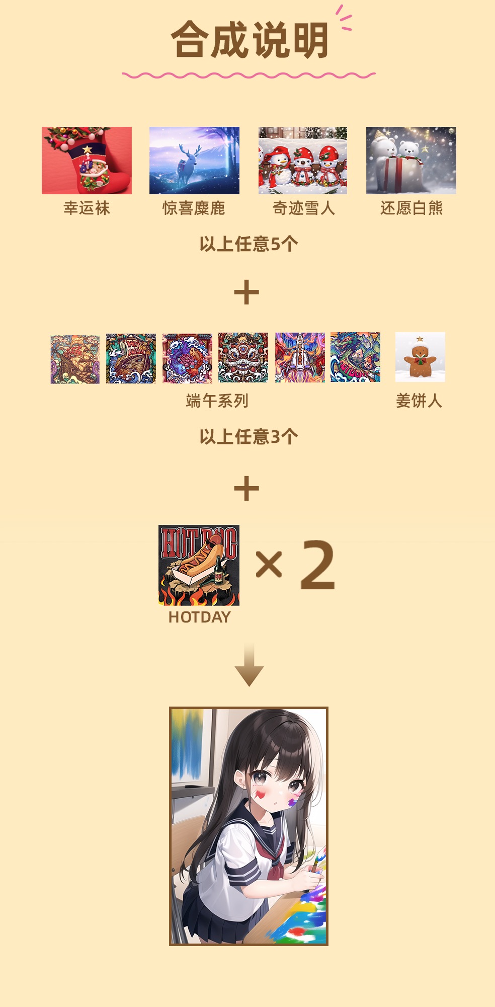 - 【端午节系列】(HOTBOAT、HOTURN、HOTWAVE、HOTWISE、HOTRISE、HOTUNITE)或「姜饼人」以上藏品任意3个