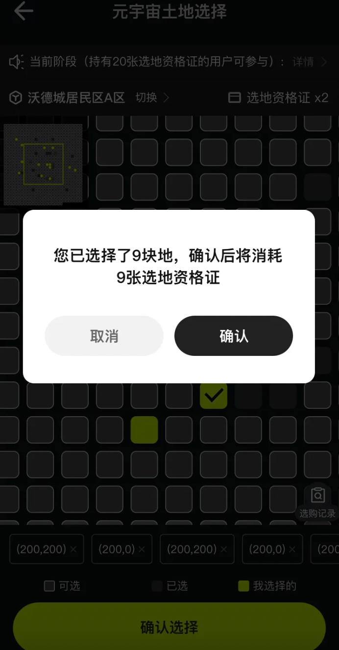 4.选择完成后玩家即完成选地操作,一旦确认选择后,无法更改或撤回,「选地资格证」即刻被消耗,敬请注意;所有玩家选地结束后将统一获得与拥有土地数量相符合的「世界秘钥」道具;使用「世界秘钥」即可激活拥有的土地,激活后的土地才可在未来土地市场中交易及使用。