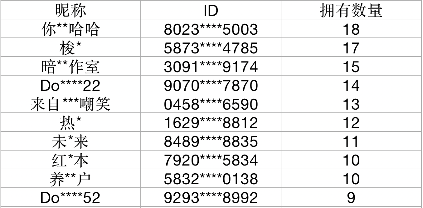 系统已于今日14:00~14:15该时间段中的随机时刻对持有「暗帝幽王」的玩家名单快照,其中持有份数数量前10的玩家为以下名单: