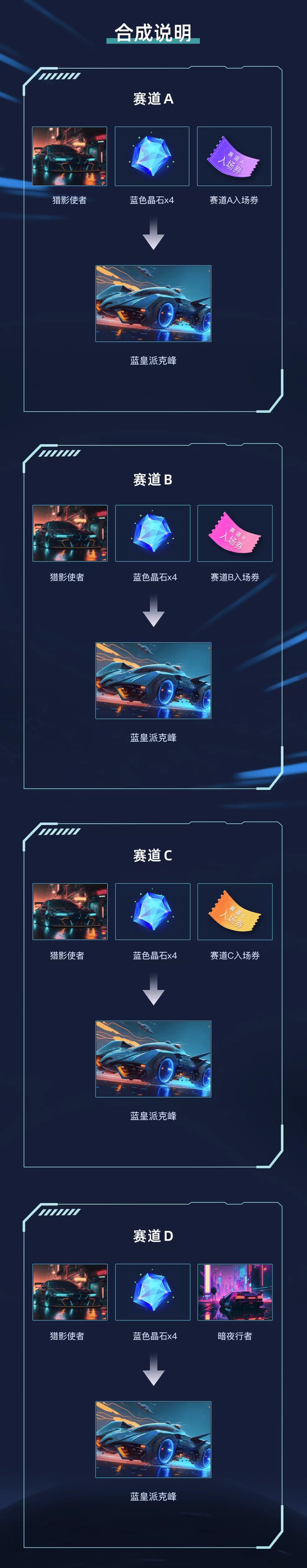 - 赛道C:消耗1份道具「赛道C入场券」+1份藏品「猎影使者」+4份晶石「蓝色晶石」的玩家可合成1份藏品「蓝皇派克峰」,权益可叠加;