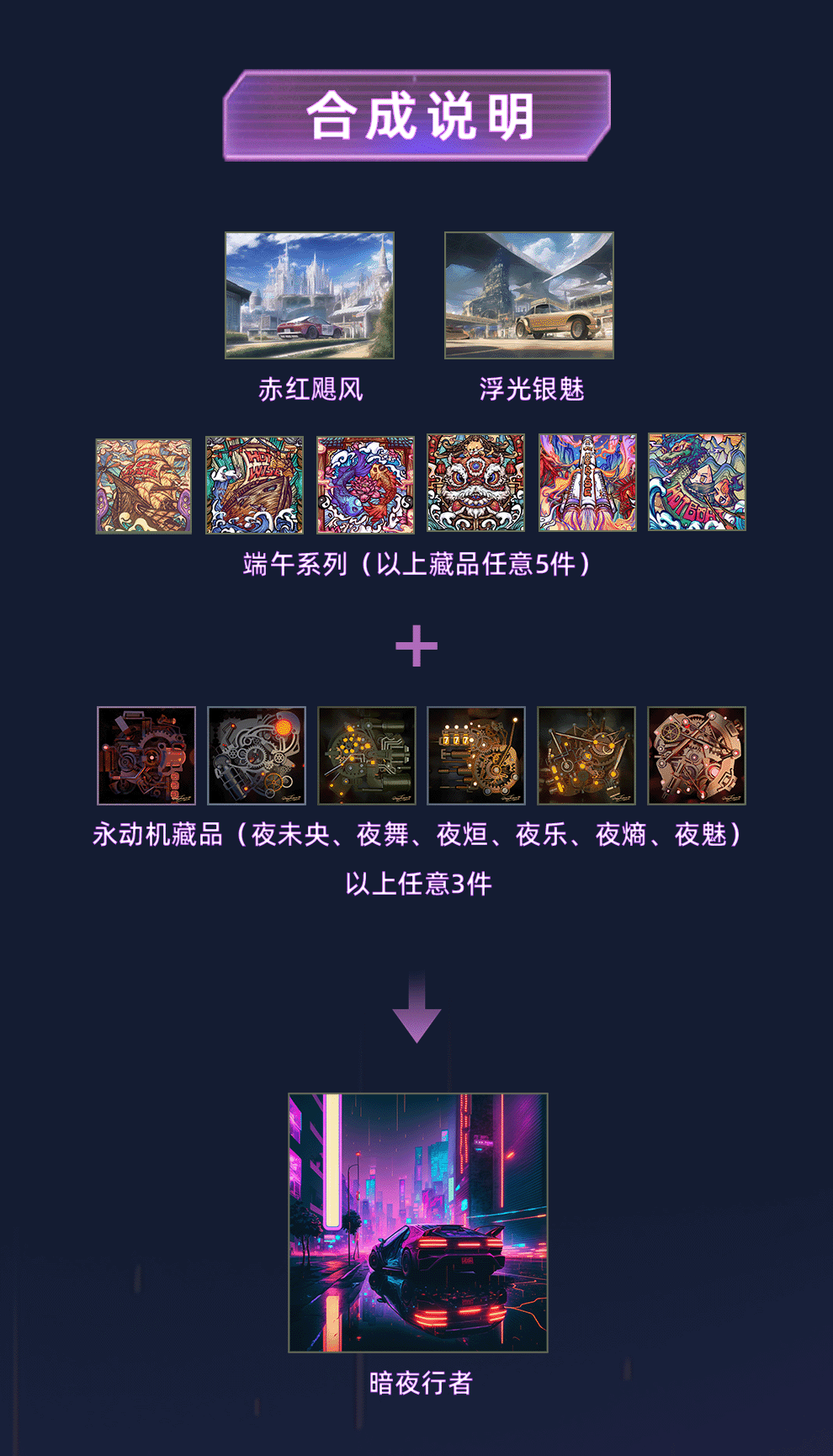 集齐「浮光银魅」或「赤红飓风」或【端午系列】(HOTBOAT、HOTURN、HOTWAVE、HOTWISE、HOTRISE、HOTUNITE)以上藏品任意5件,以及任意3件【Artverse-永动机#】盲盒系列部分藏品(永动机#夜未央、永动机#夜舞、永动机#夜烜、永动机#夜乐、永动机#夜熵、永动机#夜魅)即可合成1份「暗夜行者」,限量合成1000份。