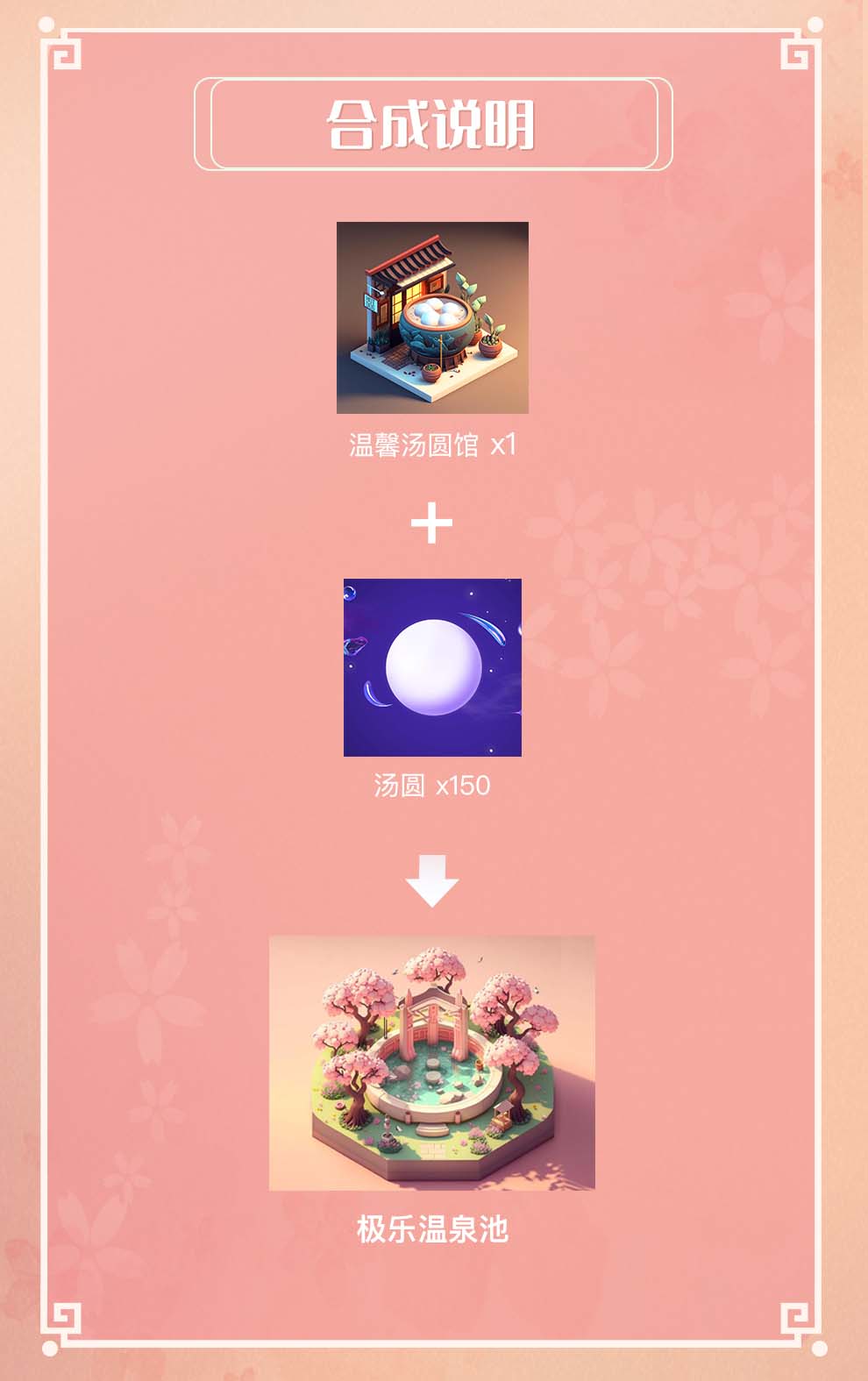 集齐「温馨汤圆馆」+「汤圆」*150即可合成1份「极乐温泉池」,限量合成300份。