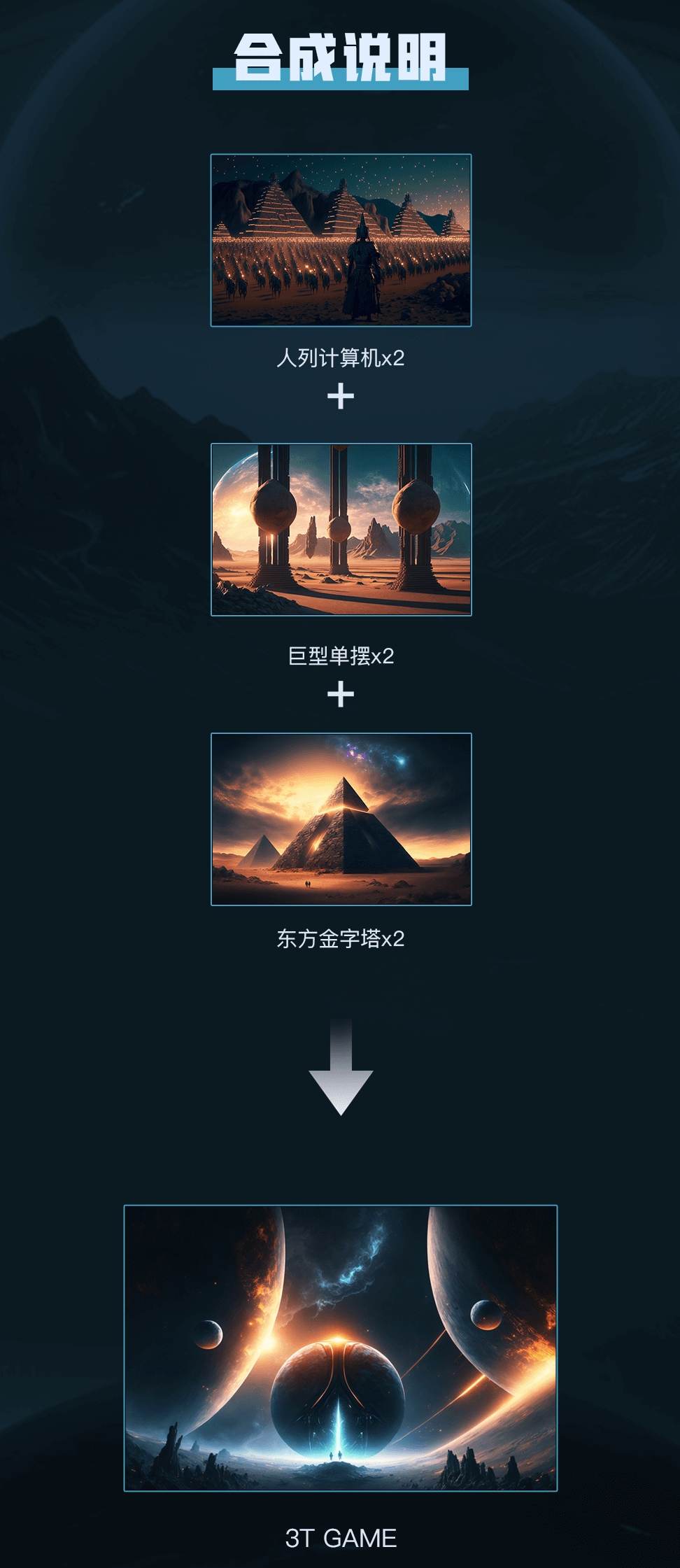 集齐「人列计算机」*2+「巨型单摆」*2+「东方金字塔」*2即可合成1份「3T GAME」,限量合成831份。