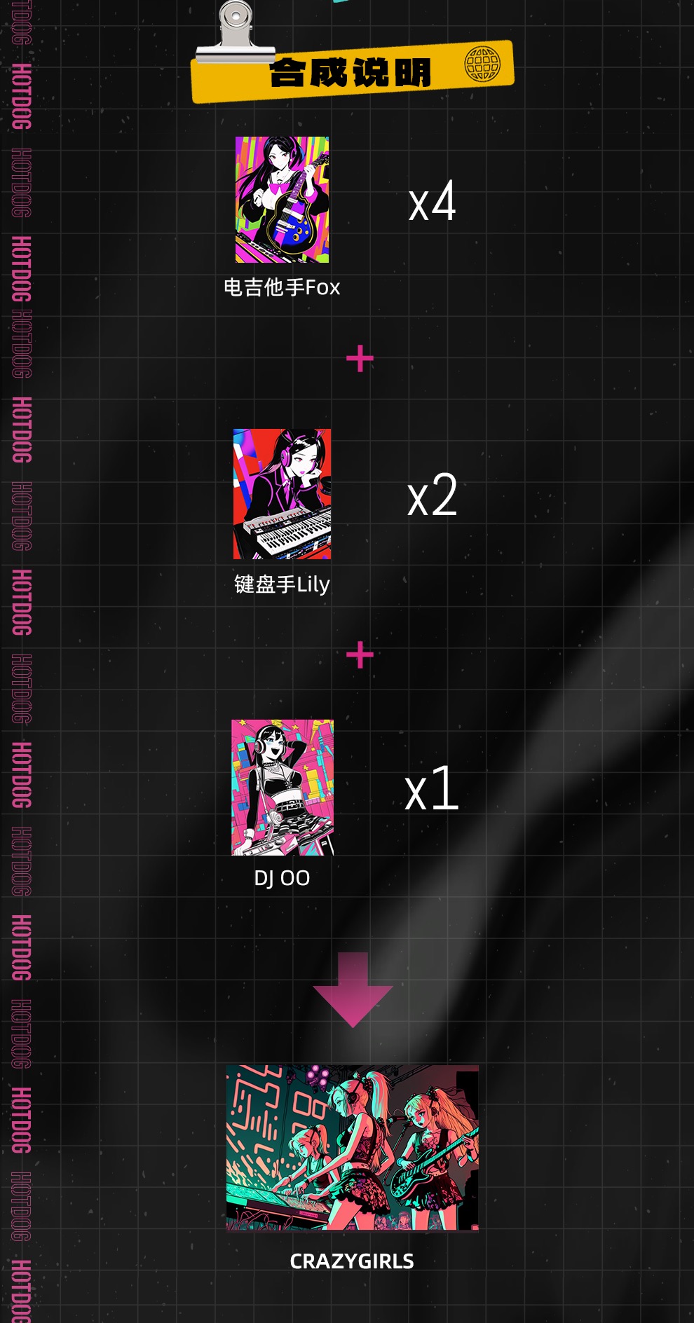 集齐「电吉他手Fox」*4+「键盘手Lily」*2+「DJ OO」即可合成1份「CRAZYGIRLS」,限量合成500份。