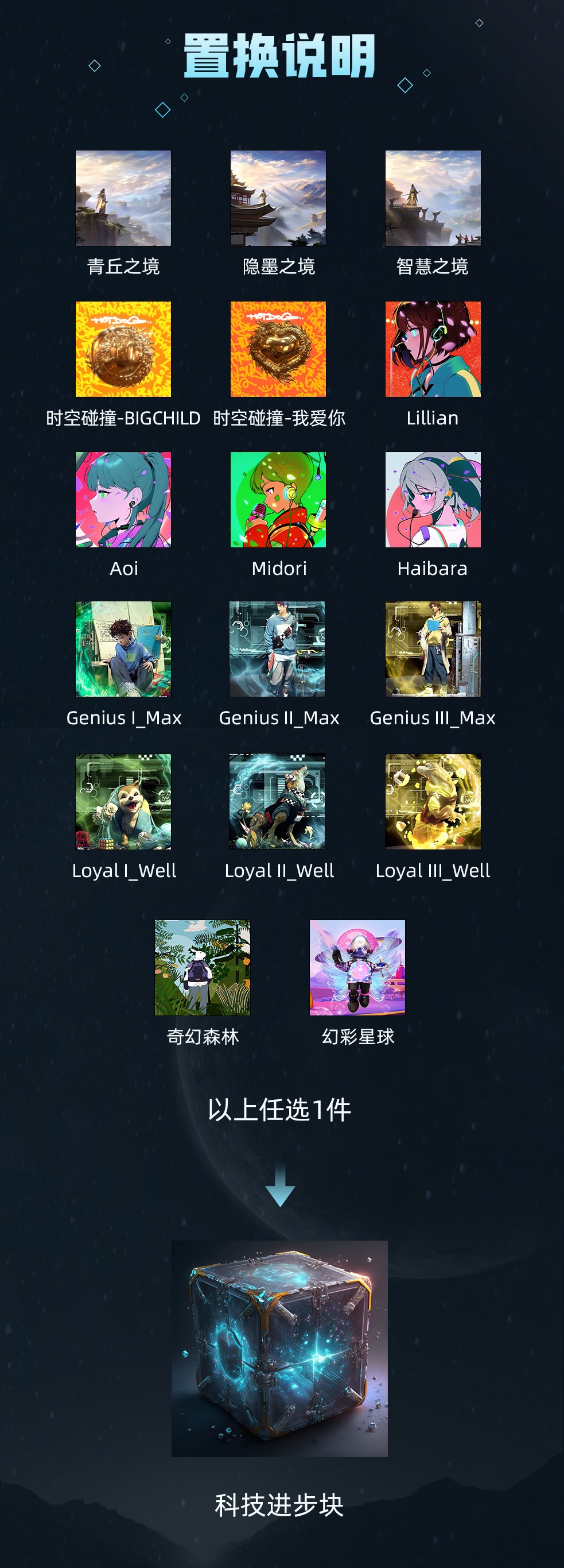 每持有「青丘之境」、「隐墨之境」、「智慧之境」、「时空碰撞-BIG CHILD」、「时空碰撞-我爱你」、「Lillian」、「Aoi」、「Midori」、「Haibara」、「Genius I_Max」、「Genius II_Max」、「Genius III_Max」、「Loyal I_Well」、「Loyal II_Well」、「Loyal III_Well 」、「奇幻森林」、「幻彩星球」以上藏品任意1份,即可置换1份「科技进步块」。