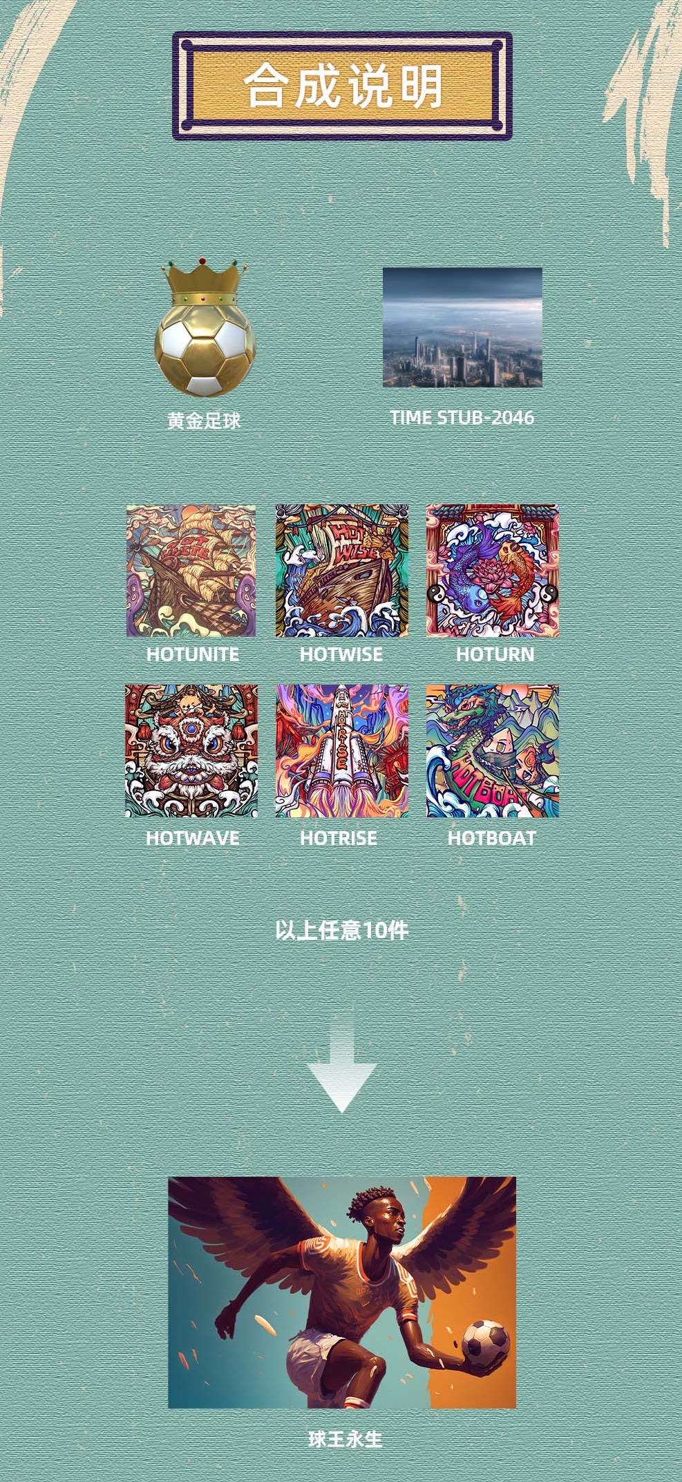 集齐「黄金足球」或「Time stub-2046」或【端午系列】(HOTBOAT、HOTURN、HOTWAVE、HOTWISE、HOTRISE、HOTUNITE)以上藏品任意10件,即可合成1份「球王永生」,限量合成500份。