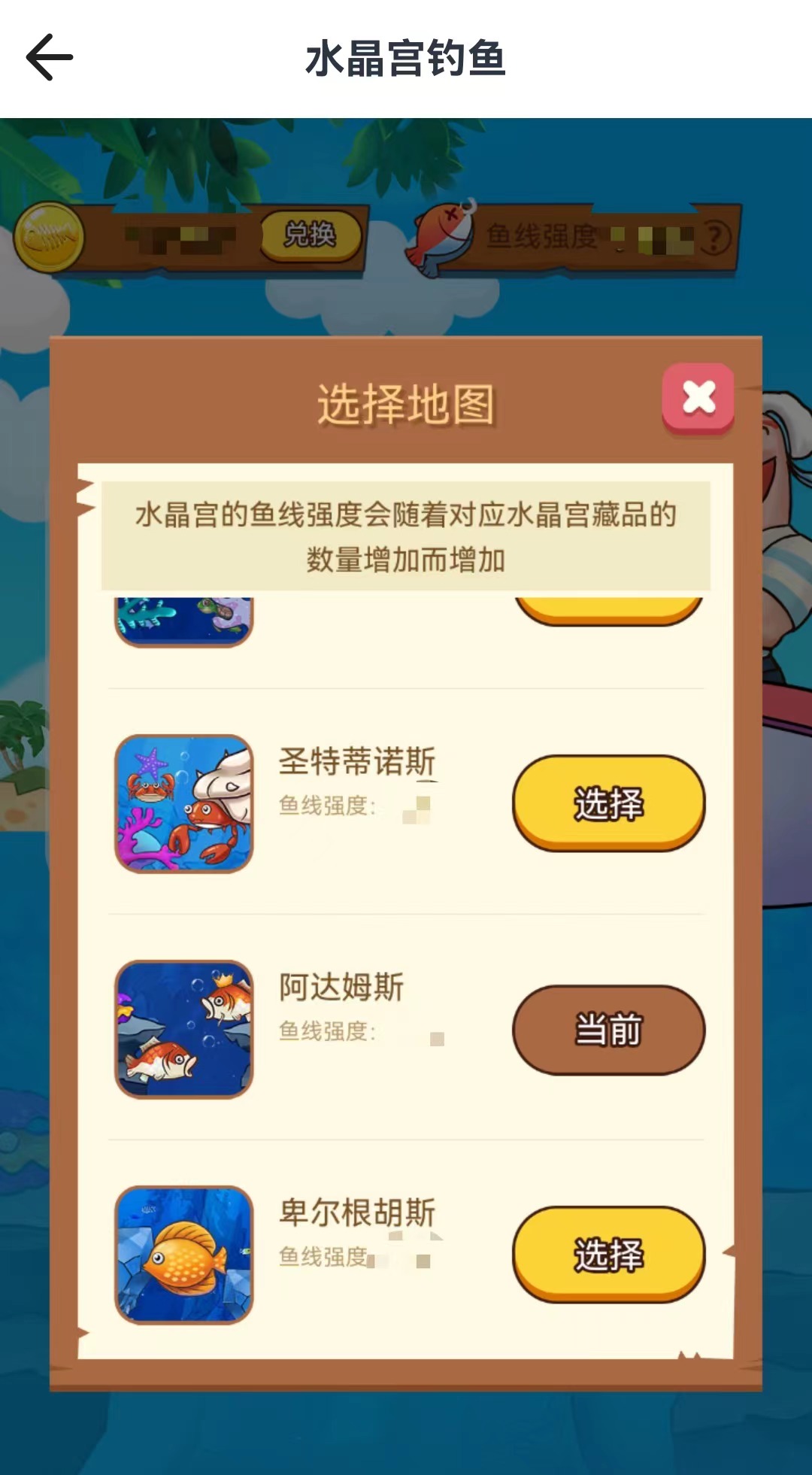 2.游戏开始前,玩家可自行选择不同的水晶宫以选择出想要垂钓的海洋生物,并消耗1个“游戏鱼饵道具”开始垂钓,垂钓过程中按住屏幕左右移动来控制鱼钩;