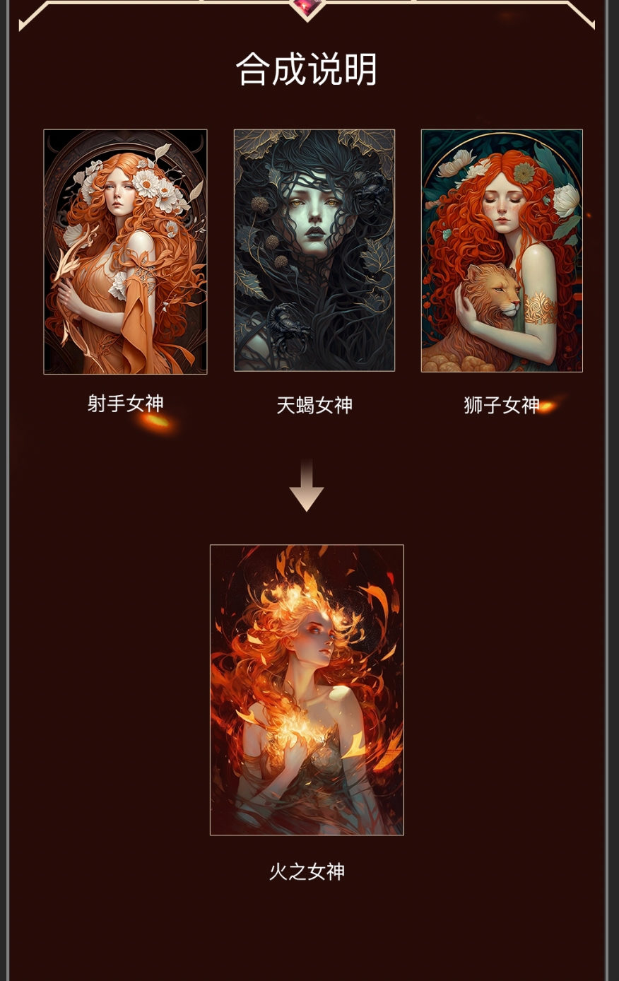 玩家每消耗【星座女神系列盲盒】(射手女神、天蝎女神、狮子女神)各1份,即可合成1份「火之女神」,限量合成250份。