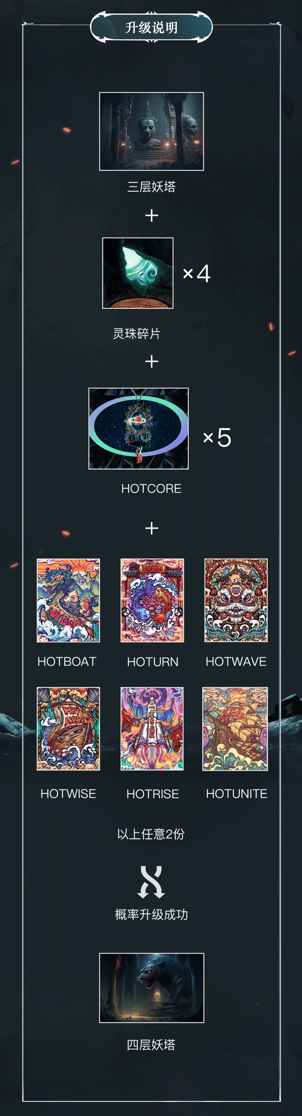 - 升级失败:「三层妖塔」藏品保留,其余藏品与道具消耗,玩家可继续为「三层妖塔」藏品升级;
